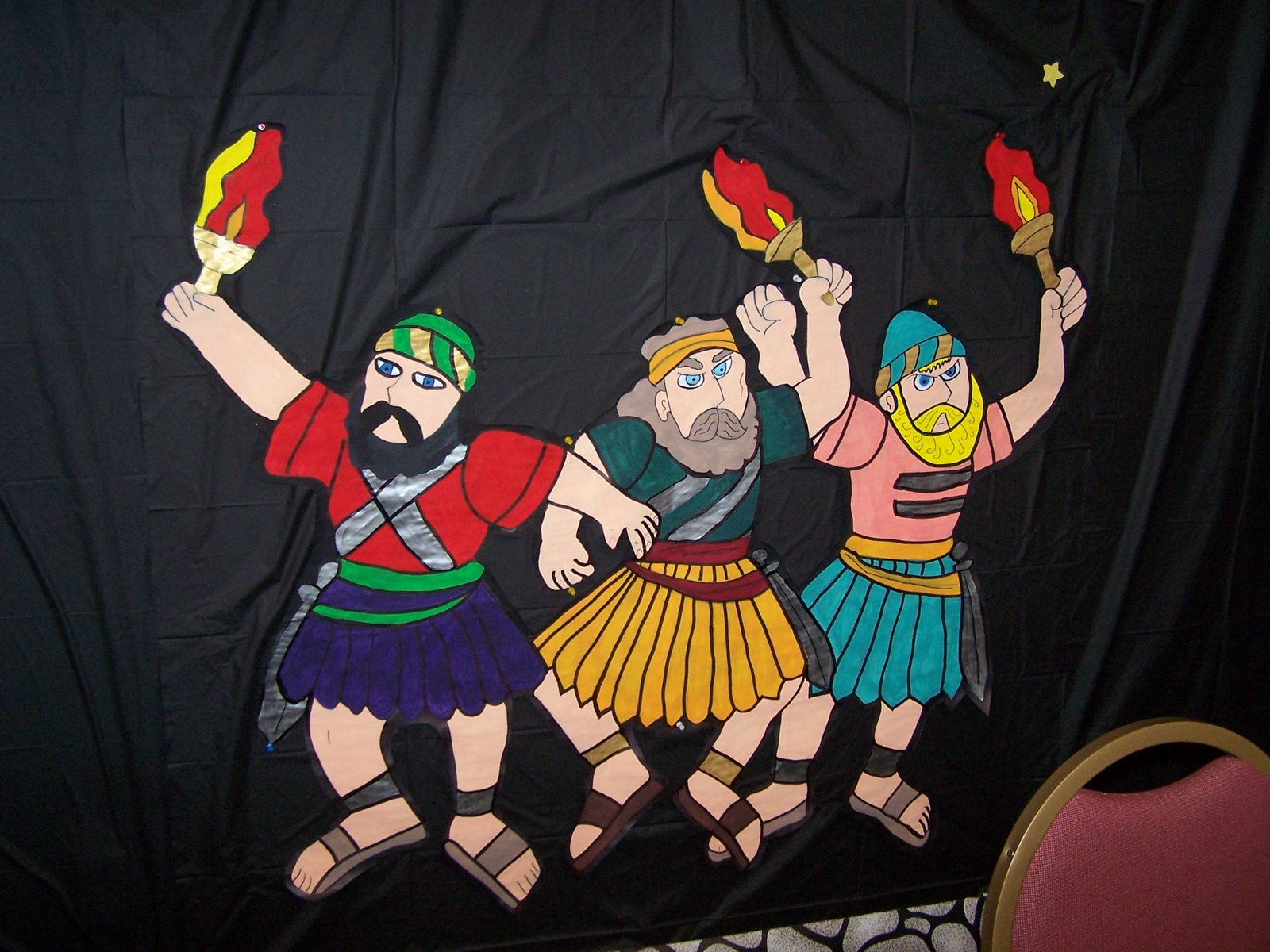 The battle plan is simple. Three groups of 100 divide and take sides around the enemy camp. Each carries a horn, an empty pitcher, and a torch. At Gideon’s command each is to break the pitcher, blow the horn, shout “The sword of the Lord and Gideon!” while revealing their torches.