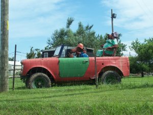 Driving a highway near Mammoth Cave National Park in Kentucky, I saw what looked like an International Scout parked in a field. Then I noticed that a couple of “Hillbilly Hounds” were enjoying a drive of their own. Alright, it was a prop to get the attention of tourists and in my case it worked, but I think I have seen those same fellows (or their kin) driving around my county! I thought it was funny and had Amy take this picture when we drove back by.