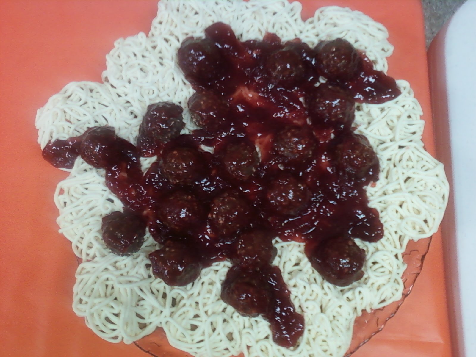 Back to this “plate of spaghetti.” What you are seeing is a dessert. Cupcakes, piped butter-cream icing (the spaghetti), a raspberry glaze (the sauce), and Ferrero Rocher Chocolates (the meatballs). Have I told you how much I love my creative and great cook of a wife?