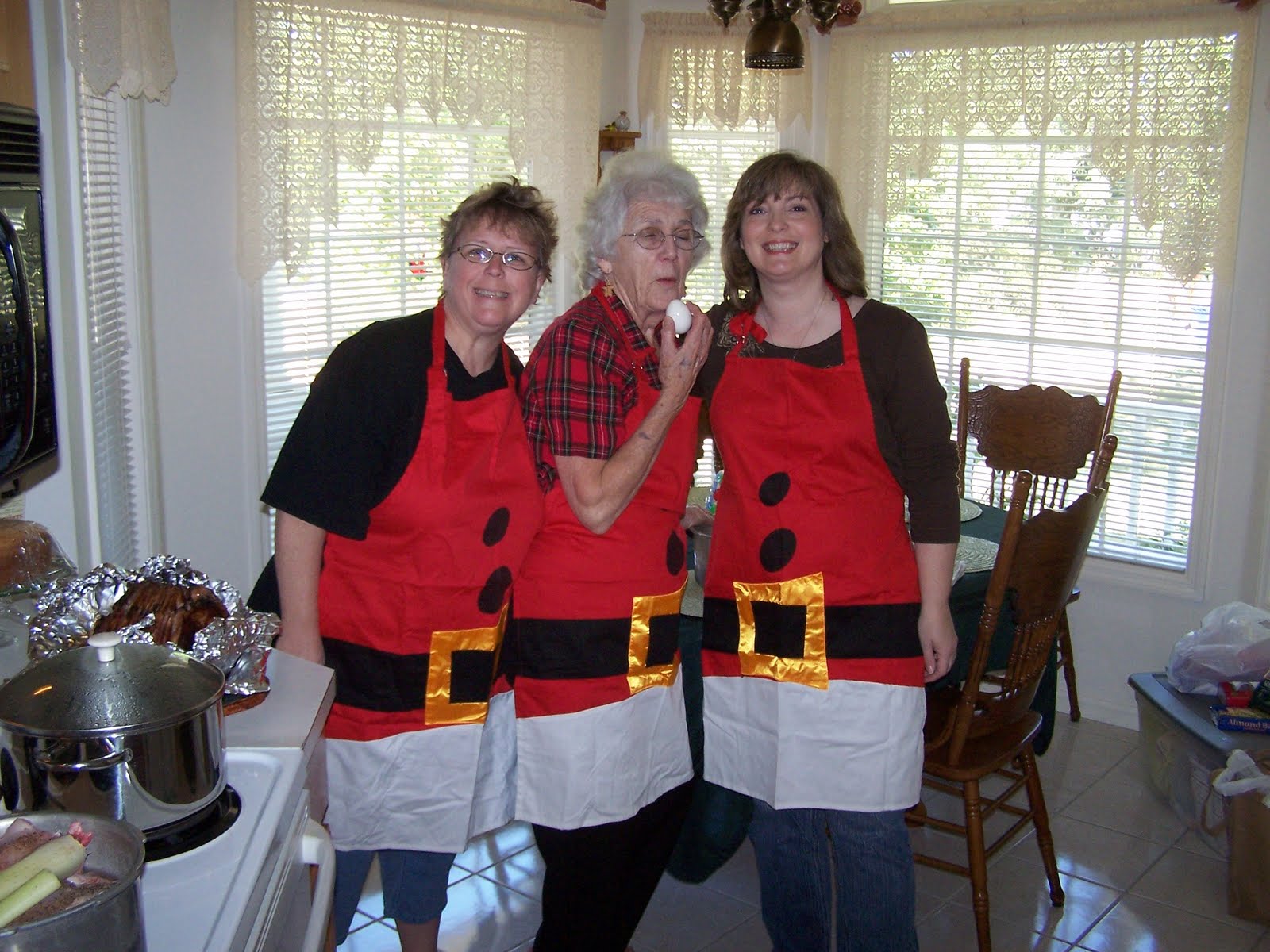 In this picture – Sister-in-Law (Tammy), Mom (Anna), and my lovely wife (Amy) model their “Santa” aprons while making deviled eggs.