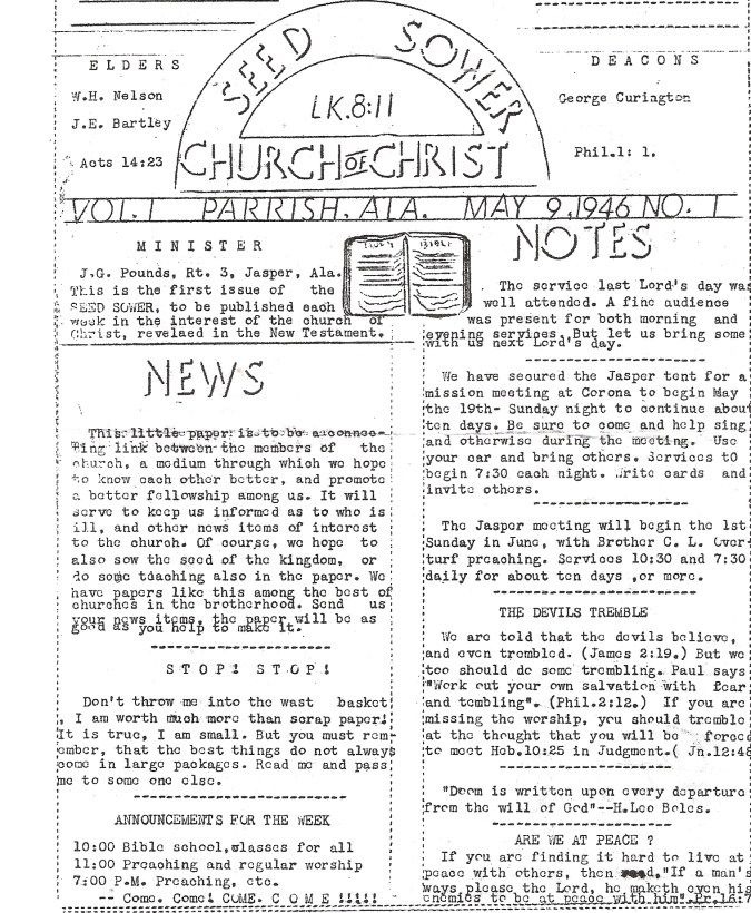 Recently someone handed me a Xerox of an issue of The Seed Sower. The Seed Sower was the first bulletin produced at Parrish Church of Christ, where I serve as minister. This copy has the following information under the title: Vol. 1 Parrish, Ala. May 9, 1946 No. 1. This is a copy of the very first issue! There are some good articles and reminders in this little paper. One section entitled Rambling Thoughts asks the following: