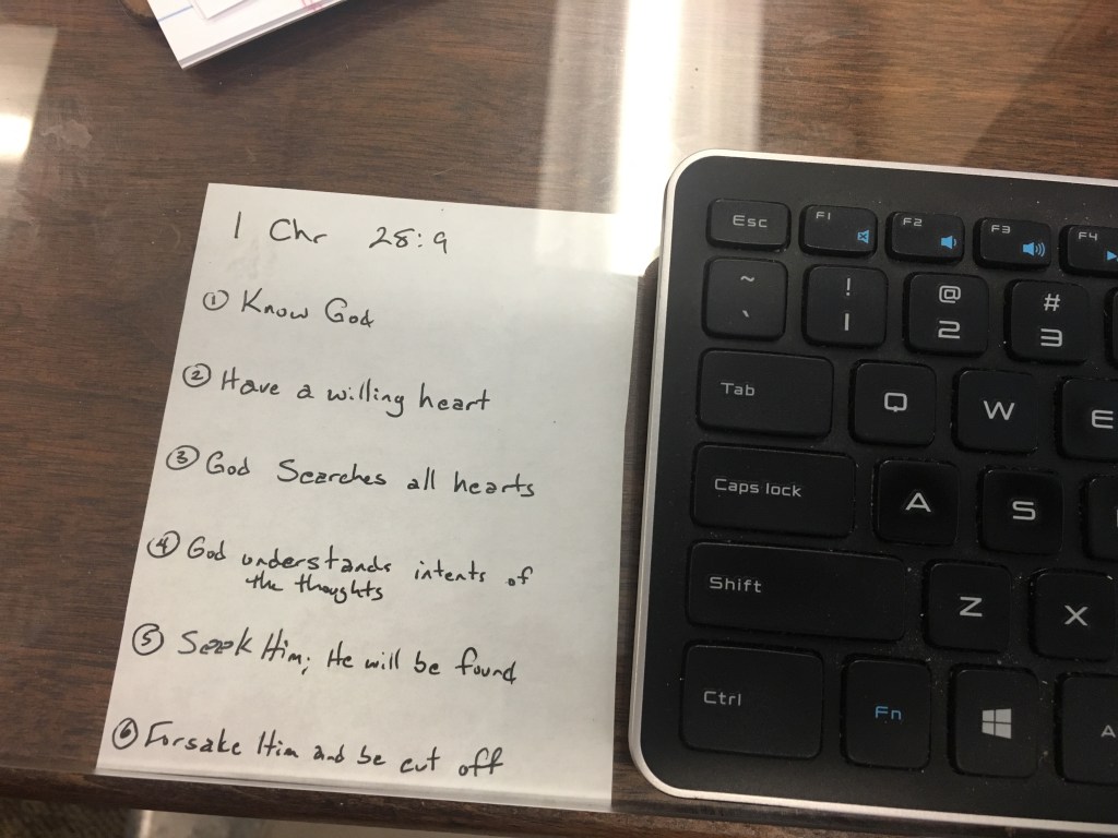 This is a picture of a note on my desk. I have had it for years and see it every day. I do not recall if I outlined the verse myself of if it was from a note I made from someone else. The note is on 1 Chronicles 28:9 as David is charging Solomon to lead God’s people, “And you, Solomon my son, know the God of your father and serve him with a whole heart and with a willing mind, for the Lord searches all hearts and understands every plan and thought. If you seek him, he will be found by you, but if you forsake him, he will cast you off forever.”