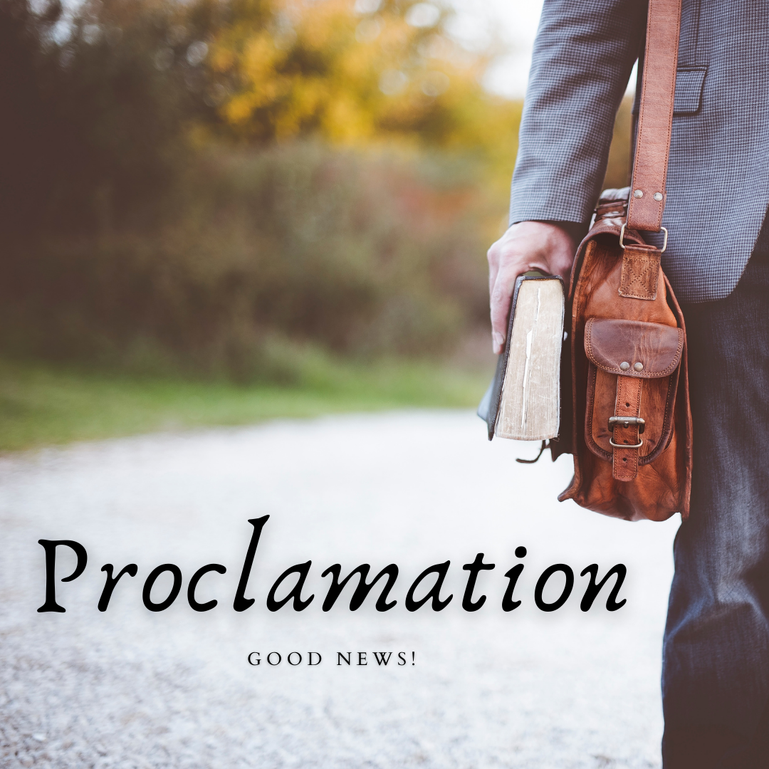 Now on to the thought of PROCLAMATION. To proclaim is to declare, to herald, to publicize, to announce, or to make known. As Christians we have something to make known, something to proclaim. “What we proclaim is not ourselves, but Jesus Christ as Lord . . . for Jesus’ sake.” (2Co 4:5). We have Good News!